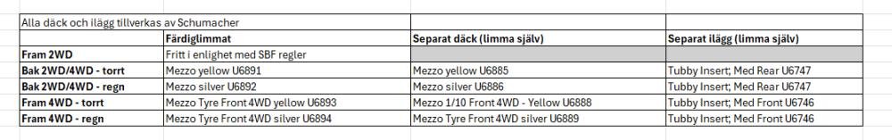 Klubbarna som arrangerar utomhus för SverigeCupen har kommit överens om att köra samma däck, enligt tabellennedan. Det är även dessa däck som kommer att gäll på årets RM, samt att vi harmoniserat med de däck som kommer att köras på NM, det är bekanta däck för oss alla i Sverige, med ett undantag, och det är att vi likt övriga Europa kommer gå till Mezzo även fram på 4WD vilket även är däcket som gäller på NM i år.