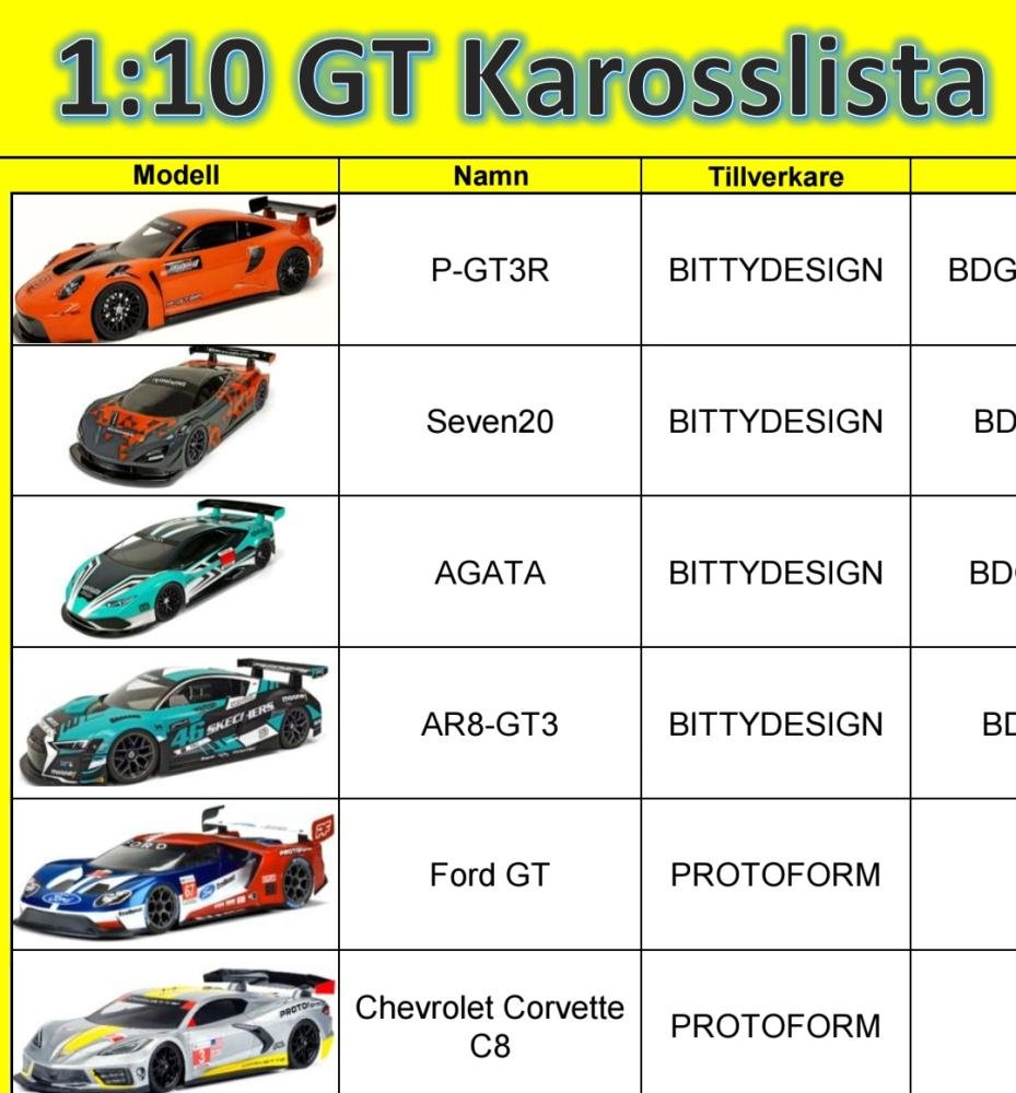GT-karosser kan ses av vissa som kontroversiellt. Våra tester både utomhus såväl som inomhus visar dock att varvtiderna blir något högre (Cirka 0.1-0.2s) men bilarna enklare att köra. De har samma och till del större vingar än dagens touring-karosser men saknar den sista ”edgen” vad gäller instyrning. Vi vill med detta även differentiera klasserna visuellt – något som är viktigt för såväl utövarnas tillfredställelse såväl som för publikens förståelse samt att det ger rätt identitet till respektive klass. GT-karosser införs gäller i 13,5 Justock klassen från 1/4-2025. Dock har vi för enkelhetens skull samt vissa önskemål gjort om regeln om vingar på just GT-karosserna. Nu är det mått på samma sätt som i “Supertouring”. Det vill säga det är tillåtet med en valfri vinge så länge den håller sig innanför boxen.