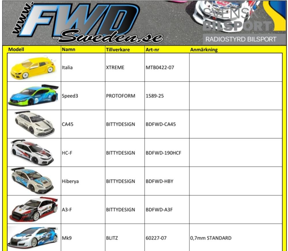 - 1:10 FWD (Framhjulsdrivna bilar med enhetsmotorer)